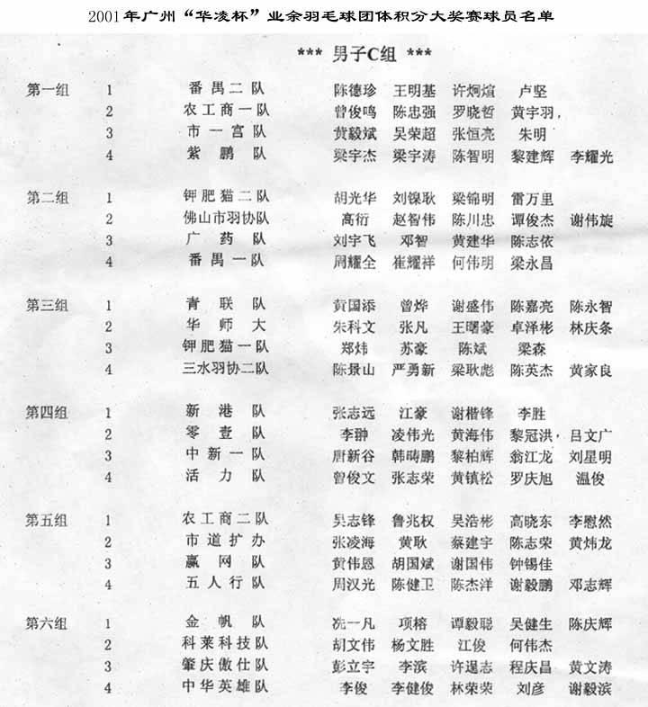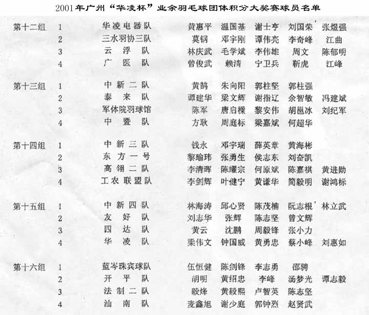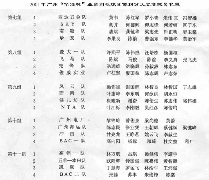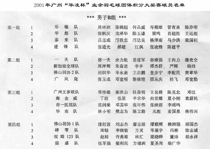2001年廣州“華凌杯”業余羽毛球團體積分大獎賽球員名單 |