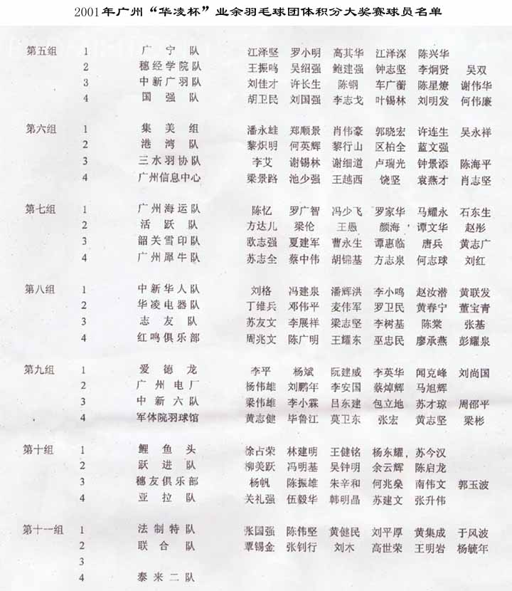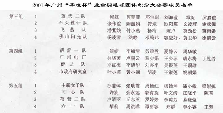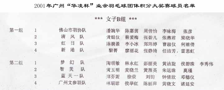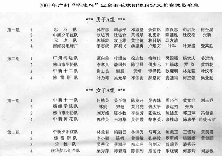 2001年廣州“華凌杯”業余羽毛球團體積分大獎賽球員名單 |