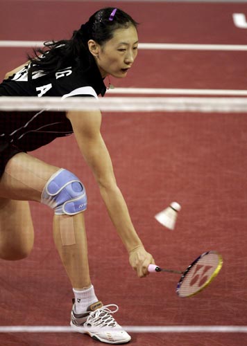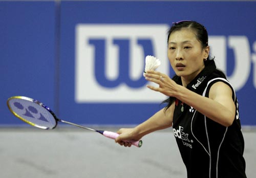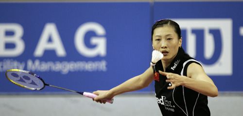 瑞士羽球賽女單張寧奪冠,張寧發球進攻 |