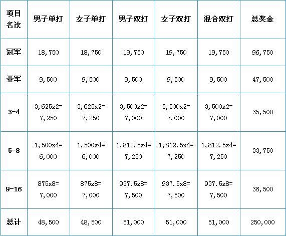 2009年李寧中國羽毛球公開賽獎金分配表(美元)