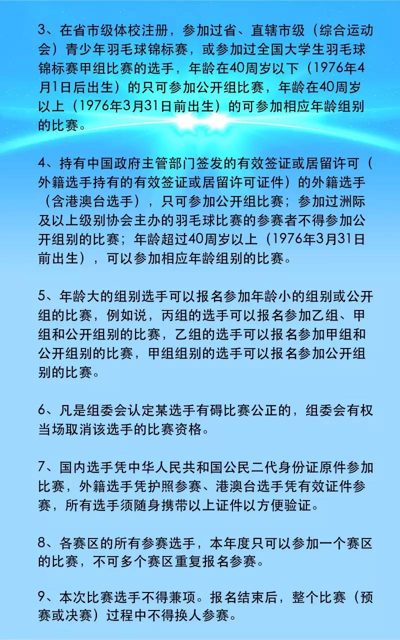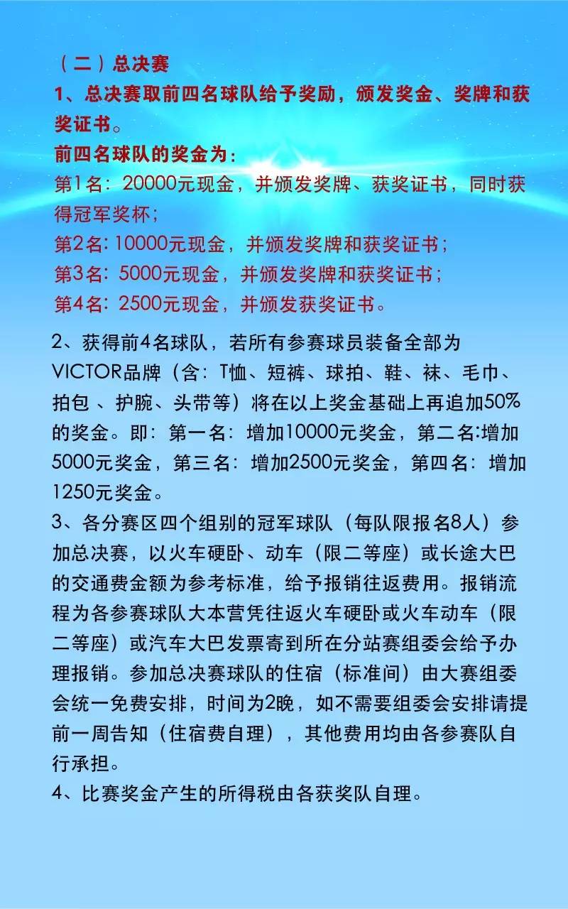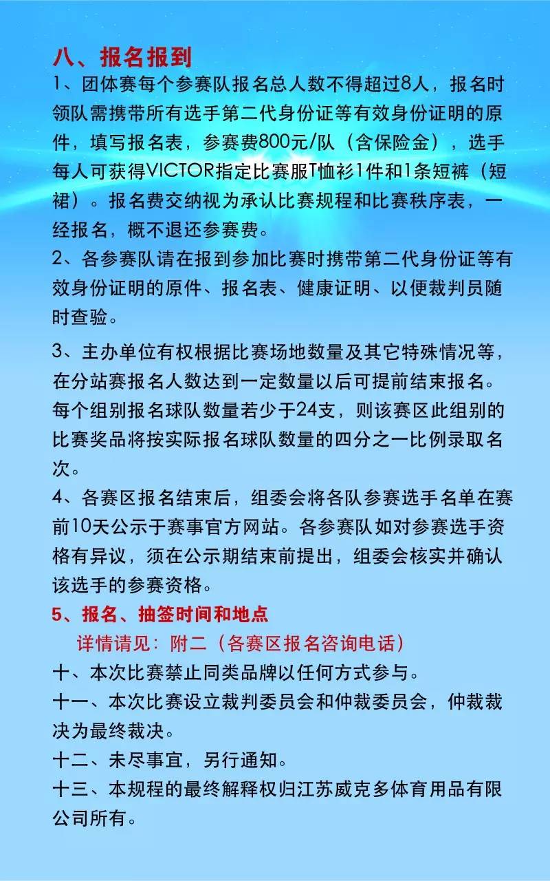 一、主辦單位:江蘇威克多體育用品有限公司 二、承辦單位:北京甜區體育文化發展有限公司 三、協辦單位:北京興羽陽體育文化發展有限公司 四、競賽時間和地點: (一)北京分站賽 比賽日期:2016年5月14日(周六)、5月15日(周日) 比賽地點:中國農業大學體育館 報名地點:北京市海淀區魏公村路8號藍天體育店 報名電話:010-62189699,微信號:13699108663 報名截止日期:2016年4月24日 也可以在網上下載報名表后通過微信、QQ報名交費。 報名表下載網址:http://www.gwtzw.cn/infor/event/victorcup2016.doc 抽簽時間:2016年5月8日下午2點 抽簽地點:北京農業大學東校區體育館 (二)總決賽 總決賽日期:2016年6月(具體日期待定) 總決賽地點:湖北武漢 五、參加球隊:業余羽毛球雙打混合團體 六、北京賽區參賽范圍:北京、河北、山東、山西 詳細競賽規程如下: