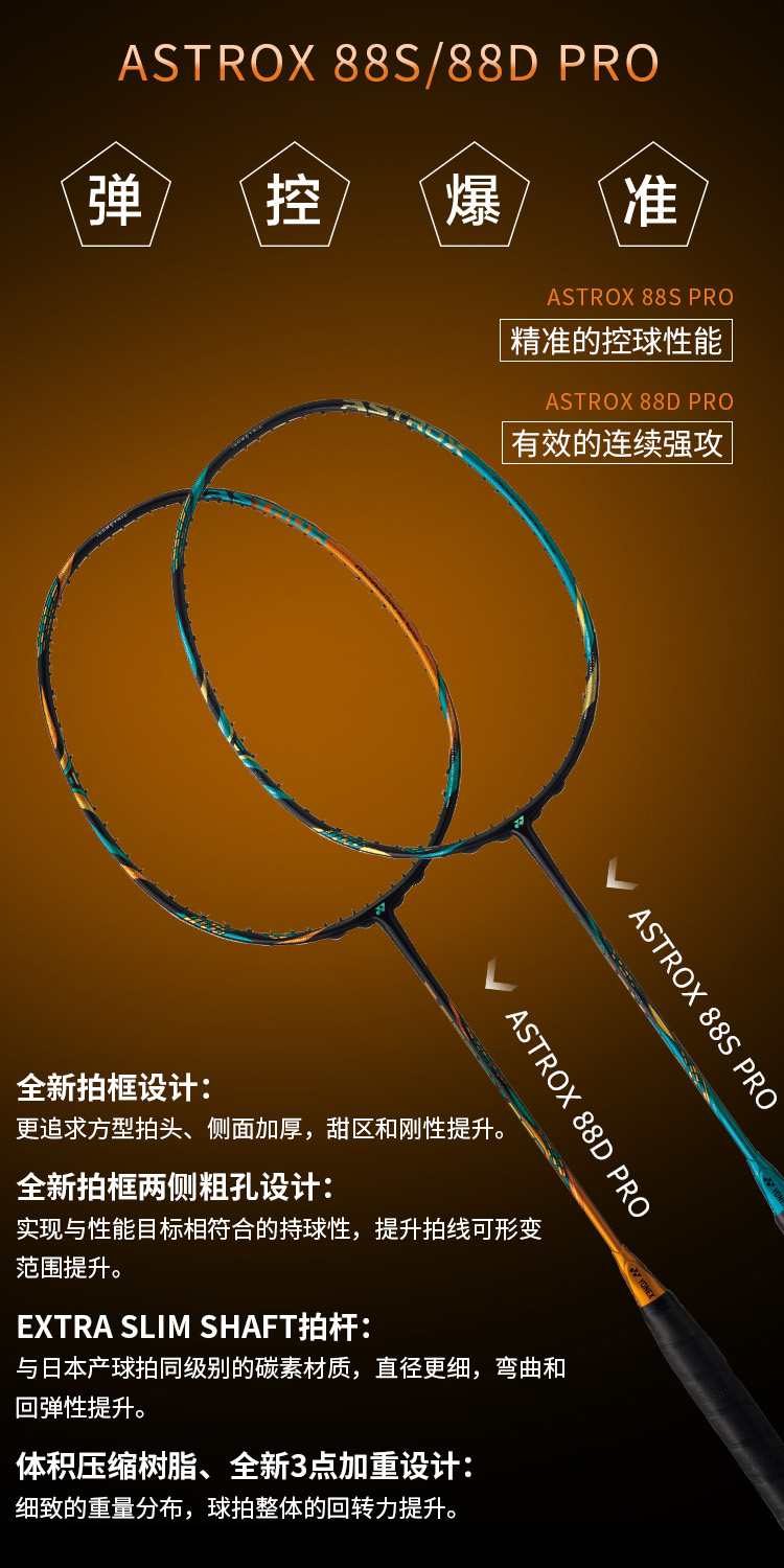 性能介紹 | YONEX AX天斧系列羽拍特點(diǎn):屬于頭重型球拍,同時(shí)具備力量和速度,助你全力擊敗對(duì)手。適合在不斷調(diào)整力量和角度的連續(xù)進(jìn)攻中尋找機(jī)會(huì),抓住破綻擊潰對(duì)手。 注:這款型號(hào)帶PRO的羽拍是之前天斧AX88D和AX88S的升級(jí)版,進(jìn)一步提升了性能! |