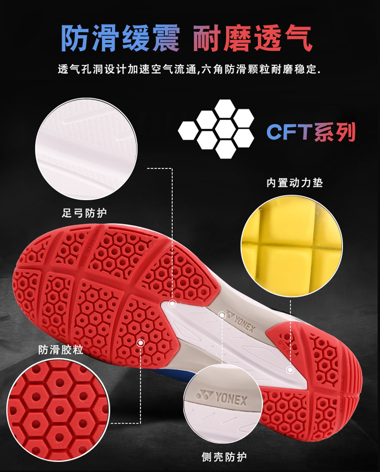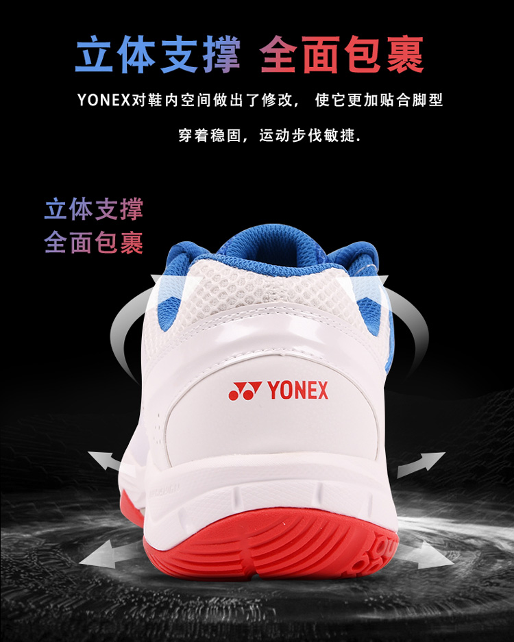 性能介紹 | 動力墊(Power Cushion):高密度復合結構動力墊在受到沖擊力后能迅速恢復原狀,減震性能好,有助于球員在球場上實現更迅敏、輕快的移動。 腳趾減壓鞋型(Toe Assist Shape):腳趾減壓鞋型設計能減小大腳趾所受壓力,同時也會提高腳中部和腳后跟的穩定舒適度,盡可能地減少球員在快速移動中能量的損耗。 TPU支撐片:鞋底中間位置安置了TPU支撐片,讓步伐變得更加穩定,增強了鞋底的牢固度,減少鞋子的扭曲。 輕量耐磨鞋面材料(Durable Skin Light):鞋面采用的這種輕型聚氨酯材料有類似橡膠般的柔韌性,又有硬塑料的硬度,在減輕鞋體重量的同時保證了鞋體的牢固性。 雙層拉舍爾透氣網面(Double Russel Mesh):超輕、耐用的拉舍爾細密纖維網眼結構,透氣性能比普通網面高8倍,能最大限度釋放鞋內的濕氣。 圓弧外底(Round Sole):YONEX圓弧外底給予運動時最大的能量轉移,為迅速流暢的步伐提供全方位的支撐。 六角膠粒外底(Hexagrip):六角膠粒外底較傳統材料減少20%重量和增加3%的抓地力,提供更敏捷穩定的步伐。 |