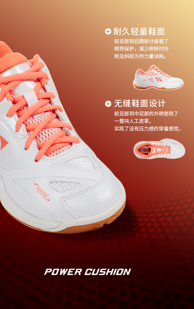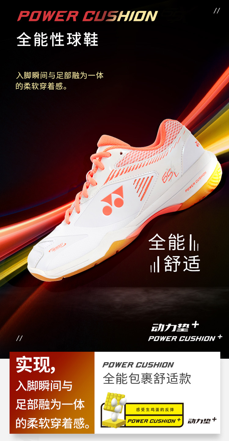 性能介紹 | YONEX SHB65系列是目前最多球星選穿的專業羽毛球鞋,有多種顏色可選,穿SHB65系列鞋的球星有:世界頭號男單桃田賢斗、世界頭號男雙吉迪恩/蘇卡穆約、世界頭號女雙福島由紀/廣田彩花、印尼頭號男單金汀、丹麥頭號男單安賽龍、日本頭號女單山口茜、日本頭號混雙渡邊勇大/東野有紗、印度頭號男單斯里坎斯、印度前頭號女單內瓦爾、丹麥頭號男雙阿斯特/拉斯姆森、韓國名將李龍大/金基正等,數不勝數。 動力墊+(Power Cushion+):新型的動力墊上增加了一種有彈性的合成樹脂材料,比傳統動力墊的減震性提升了28%的,反彈力提升62%。 腳趾減壓鞋型(Toe Assist Shape):腳趾減壓鞋型設計能減小大腳趾所受壓力,同時也會提高腳中部和腳后跟的穩定舒適度,盡可能地減少球員在快速移動中能量的損耗。 鞋側防護殼(Lateral Shell):位于鞋面外側,防止腳底邊緣的滑動,減少能量損失,提供順暢的腳步轉換成進攻的步伐。 自適應貼腳鞋墊(Syncro-Fit Insole):提供腳跟更多的支撐并減少足部與球鞋間的空隙,自適應貼腳鞋墊確保球鞋有最大的抓地力并提供較好的舒適感。 圓弧外底(Round Sole):YONEX圓弧外底給予運動時最大的能量轉移,為迅速流暢的步伐提供全方位的支撐。 六角膠粒外底(Hexagrip):六角膠粒外底較傳統材料減少20%重量和增加3%的抓地力,提供更敏捷穩定的步伐。 |