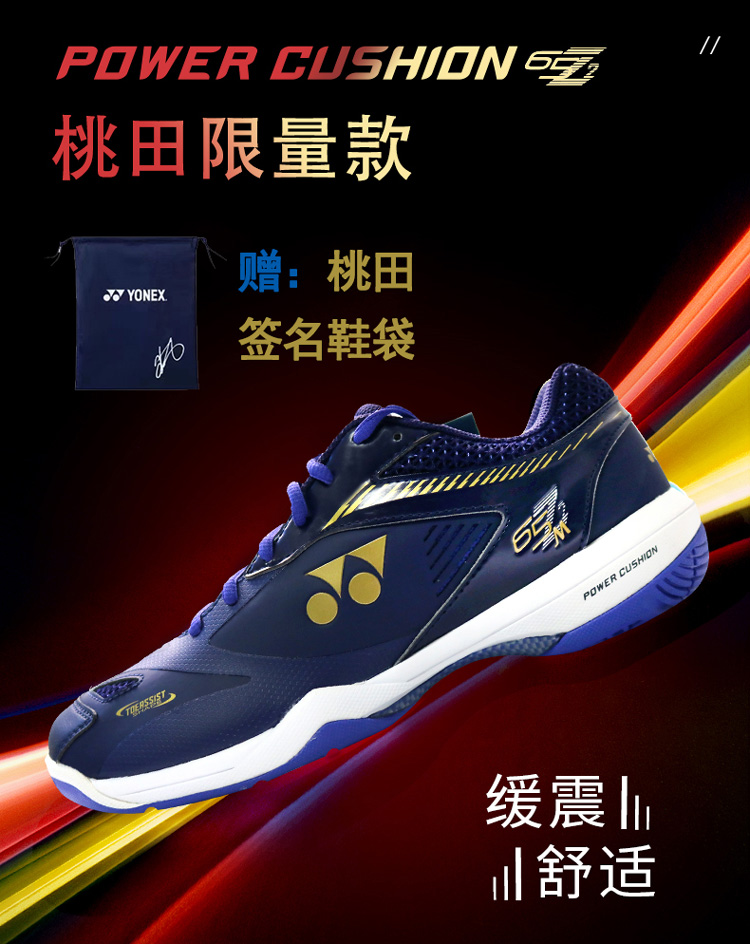 性能介紹 | YONEX SHB65系列是目前最多球星選穿的專業羽毛球鞋,有多種顏色可選,穿SHB65系列鞋的球星有:世界頭號男單桃田賢斗、世界頭號男雙吉迪恩/蘇卡穆約、世界頭號女雙福島由紀/廣田彩花、印尼頭號男單金汀、丹麥頭號男單安賽龍、日本頭號女單山口茜、日本頭號混雙渡邊勇大/東野有紗、印度頭號男單斯里坎斯、印度前頭號女單內瓦爾、丹麥頭號男雙阿斯特/拉斯姆森、韓國名將李龍大/金基正等,數不勝數。 動力墊+(Power Cushion+):新型的動力墊上增加了一種有彈性的合成樹脂材料,比傳統動力墊的減震性提升了28%的,反彈力提升62%。 輕量動力碳板(Power Graphite Lite):置于鞋底中部的超輕動力碳板既增加了著地時的穩定性,又減輕了鞋的重量。 腳趾減壓鞋型(Toe Assist Shape):腳趾減壓鞋型設計能減小大腳趾所受壓力,同時也會提高腳中部和腳后跟的穩定舒適度,盡可能地減少球員在快速移動中能量的損耗。 鞋側防護殼(Lateral Shell):位于鞋面外側,防止腳底邊緣的滑動,減少能量損失,提供順暢的腳步轉換成進攻的步伐。 自適應貼腳鞋墊(Syncro-Fit Insole):提供腳跟更多的支撐并減少足部與球鞋間的空隙,自適應貼腳鞋墊確保球鞋有最大的抓地力并提供較好的舒適感。 圓弧外底(Round Sole):YONEX圓弧外底給予運動時最大的能量轉移,為迅速流暢的步伐提供全方位的支撐。 六角膠粒外底(Hexagrip):六角膠粒外底較傳統材料減少20%重量和增加3%的抓地力,提供更敏捷穩定的步伐。 雙層拉舍爾透氣網面(Double Russel Mesh):超輕、耐用的拉舍爾細密纖維網眼結構,透氣性能比普通網面高8倍,能最大限度釋放鞋內的濕氣。 |
