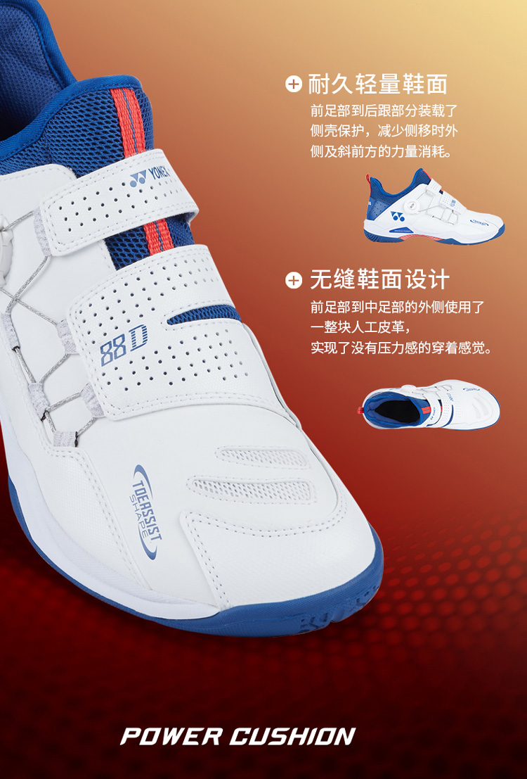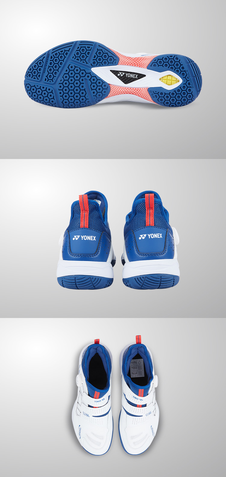 性能介紹 | 旋鈕調節系統(BOA Fit System):調節旋鈕可以輕松地擰緊或放松鞋繩,讓腳趾和腳踝部位迅速調節到比較舒適的貼合位置,舒緩傳統鞋帶的緊繃感。 鞋舌鞋口一體設計(Inner Bootie):減少鞋舌和鞋口材料的重疊,減輕重量的同時減少腳背和球鞋的空隙,更加貼合腳型,提高舒適度。 自適應貼腳鞋墊(Syncro-Fit Insole):提供腳跟更多的支撐并減少足部與球鞋間的空隙,自適應貼腳鞋墊確保球鞋有最大的抓地力并提供較好的舒適感。 動力墊+(Power Cushion+):新型的動力墊上增加了一種有彈性的合成樹脂材料,比傳統動力墊的減震性提升了28%的,反彈力提升62%。 輕量動力碳板(Power Graphite Lite):置于鞋底中部的超輕動力碳板既增加了著地時的穩定性,又減輕了鞋的重量。 腳趾減壓鞋型(Toe Assist Shape):腳趾減壓鞋型設計能減小大腳趾所受壓力,同時也會提高腳中部和腳后跟的穩定舒適度,盡可能地減少球員在快速移動中能量的損耗。 輕量強韌中底(ToughBird Light):新型的輕量強韌中底比舊式的中底輕了11%,減輕了腿部和膝蓋的負擔。 圓弧外底(Round Sole):YONEX圓弧外底給予運動時最大的能量轉移,為迅速流暢的步伐提供全方位的支撐。 六角膠粒外底(Hexagrip):六角膠粒外底較傳統材料減少20%重量和增加3%的抓地力,提供更敏捷穩定的步伐。 |
