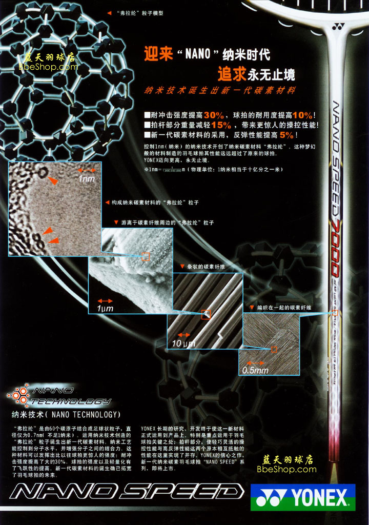 性能介紹 | 日本YONEX公司2006年最新產品,采用YONEX最新羽拍技術--納米技術(Nano Technology),一如既往,引領同行! 所謂納米,是目前被應用到的最小長度單位,1納米=10億分之1米,人體高度約等于20億納米,DNA約等于2納米…… 近年來,納米科技應用越來越廣,使我們的生活有了很大改觀,從醫藥到能源、通信、交通、電子、軍事、家居……滲透在每件事物之中,現在,納米科技開始在體育行業初露鋒芒…… 很久以前,人們用一種叫做木材的材料制作球拍,但這種材料質地疏松、缺乏彈性、笨重且容易折斷;若干年以前,人們發現鋁合金不僅適用于飛機汽車,用作球拍拍框也有出色表現,但很快發現這種材料彈性和強度都無法滿足高水平選手的要求;再后來,質輕彈性好的碳素纖維開始壟斷球拍材料業,隨后又結合了鈦合金、超鈦等航空材料,但這些都無法改變碳素纖維之間存在的細小間隙,正是這種間隙極易造成彈性疲勞及削弱球拍強度。 如今,YONEX成功地將直徑0.7納米(nm)的納米級材料“弗拉綸”粒子滲透到碳原子的間隙之間,對所有碳纖維組織在分子鍵的基準上進行補強,使球拍抗沖擊強度提高30%,耐用度提高10%,拍桿部分重量減輕15%,反彈性能提高5%! “弗拉綸”是由60個碳原子結合成足球狀粒子,直徑僅為0.7納米。應用納米技術創造的“弗拉綸”粒子誕生出新一代碳素材料。納米工藝能控制到分子水平,并增強分子之間的結合力。這種材料可以發揮出比以往球拍更驚人的強度:耐沖擊強度提高了大約30%。球拍的強度以及輕量化有了飛躍性的提高。新一代碳素材料的誕生確已拓寬了羽毛球拍的未來。YONEX長期的研究、開發終于使這一新材料正式應用到產品上,特別是重點應用于羽毛球拍關鍵之處:拍桿部分,使輕巧靈活的操控性能與高反彈性能這兩個相互抵觸的性能在這里實現了并存。YONEX的信心之作——新一代納米碳素羽毛球拍“NANO SPEED”系列,現已隆重登場! 1、納米級材料“弗拉綸”粒子模型圖解: 2、采用納米技術的球拍壁厚可減薄20%,從而使重量減輕約15%,而操控性能更優越: 3、球拍抗沖擊強度提高約30%,耐用度提高10%: 4、新一代納米碳素的采用,球拍反彈性能提高5%: 5、拍框上部線槽運用單通道線孔設計,采用交錯式穿線方法,有效改善拍框承載耐用度。在激烈的雙打比賽中,搭檔之間的球拍碰撞往往很容易造成拍框折損。在此羽拍上運用了單通道線孔設計,使拍框在2點鐘和10點鐘位置受力負荷更均勻,提高拍框耐用度7%,從而降低了球拍碰撞的折損率。 6、在拍框頭部采用了Muscle Power弧形筋力結構拍框線槽設計,可有效保持拍線張力,并使扣球速度提升5%。傳統球拍的承線系統中,拍線被直接支撐在尖銳的線孔膠粒邊緣上,拉線后拍線與膠粒的兩個接觸點會產生應力集中現象,拍線容易疲勞,張力下降快(俗稱掉磅現象)。但MP結構球拍的線床即使在拉線七天后,仍能保持良好的張力狀態為扣殺提供強勁的力量。另外新的MP結構系統將拍線支撐在圓拱形的線槽上,兩個接觸點被連接為一段接觸弧面,不但有效消除應力,而且形成的緊密接觸弧面大大增強了拍線與拍框的整體效應,從而增強球拍的整體穩定性和力量性能,使扣球時蘊藏在球拍內的巨大能量直接了當地傳遞給羽毛球,使扣球速度提升5%。 7、球拍拍框采用破風式流線型截面設計,有效減小風阻: 8、拍框形狀為ISO方形,擴大了拍面的擊球甜點區域。與傳統球拍相比,方形拍頭能提供多32%的有效擊球面積(擊球甜區),即使是偏離球拍線床中心區的連續扣殺也能保持相應的精確和速度: 9、拍框和拍桿內部連接處采用內置T型接頭連接結構(Built-in T-Joint),以傳送更大擊球力量。在大力擊球時,拍框受到的扭力瞬間傳遞到球拍的T型位置,T型部位承受著巨大的力學負荷。深藏于拍框和拍桿連接處碳素纖維內層的內置T型合金接頭,使所有YONEX高精度兩段式工藝生產的碳素纖維球拍完美地連接成一支高強度的一體式球拍。此聞名遐邇的內置T型接頭連接結構是YONEX的世界性獨家專利,讓YONEX球拍同時兼具強大的力量性和精確的控球性能: |